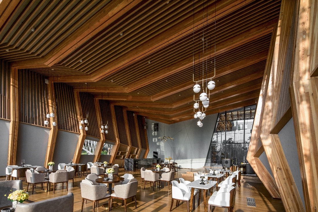 Exposed Glulam structures are applied as the crucial visual element for wooden buildings. The order and form similar to the sloping roofs in Chongqing are adopted for expression. Architects convert varying units into structural components and arrange those components in a certain changing mode, so that the architectural form changes with the space.