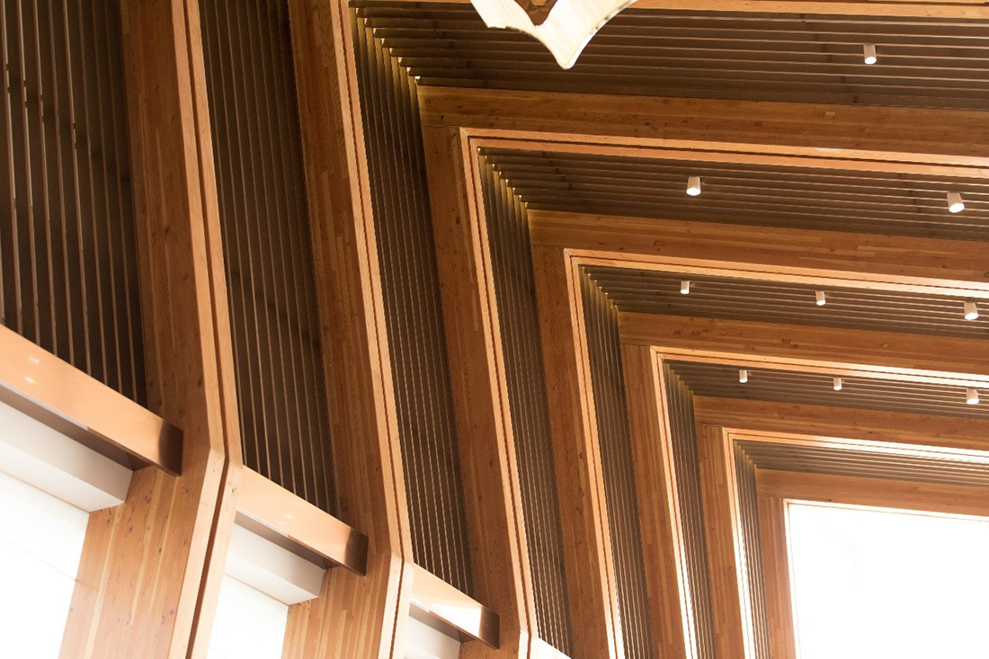 Wood components are lapped straight and well-structured in elaborate layout, with a strong sense of construction. Smooth lines and a sense of unity make the building space extremely charming. Dynamic balance of components presents architectural features and livens up the space.