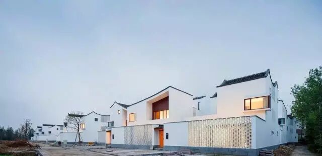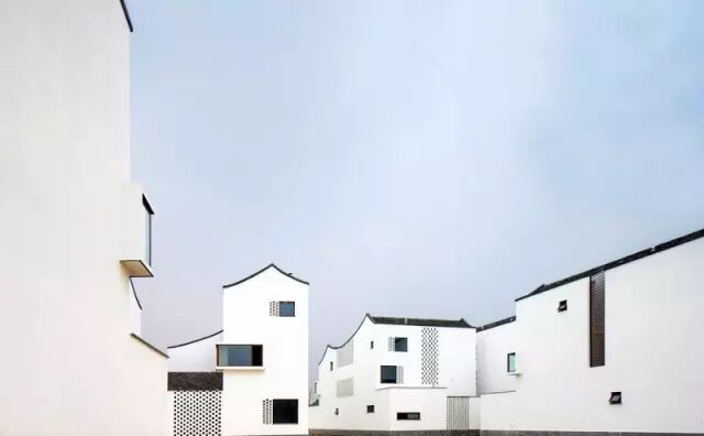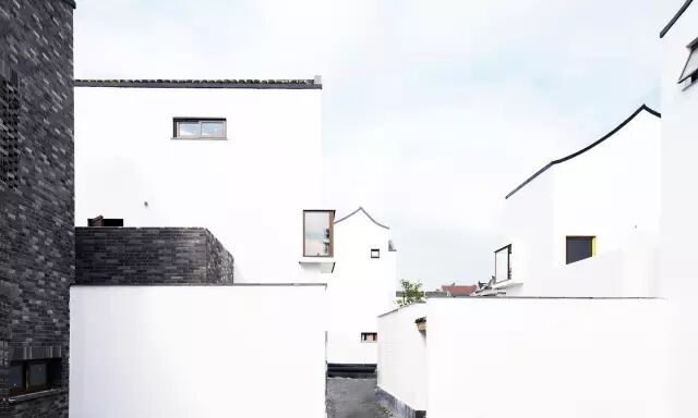 色调是白墙绿瓦,中间有一些灰色系的砖,都是老色调的基底给我们的感觉。压顶的线条,像极了吴冠中的画,都很抽象,没有具象的符号。